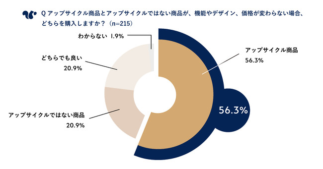 - 価格や機能が変わらなければアップサイクル商品を買うと人が56%と、非アップサイクル商品を選ぶ人(21%)よりも多い