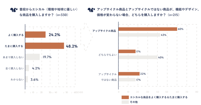 アップサイクルという言葉を知っている人の中で普段からエシカル(環境や地球に優しい)商品を「よく購入する」人は24.2%、「たまに購入する」人は48.2%で全体の半数を超える72.4%となりました。アップサイクル商品とアップサイクルではない商品が、機能やデザイン・価格が変わらない場合、どちらを購入するか調査したところ普段からエシカルな商品を「よく購入する」人と「たまに購入する」人の60%が、アップサイクル商品を購入すると答え、日頃からエシカルな商品を購入する人のほうがアップサイクル商品の購入意向も高いことがわかりました。