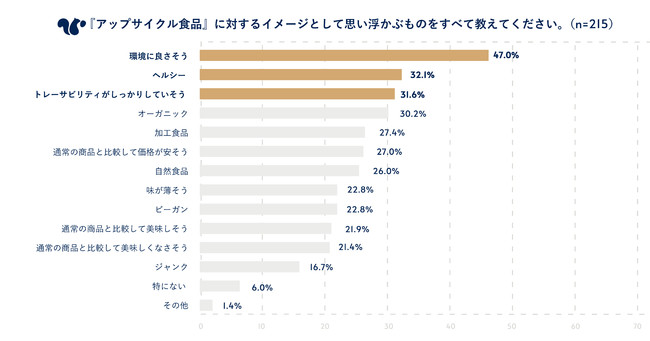 アップサイクル食品に対するイメージとして思い浮かぶものを調査すると、「環境によさそう」47.0%、「ヘルシー」32.1%、「トレーサビリティがしっかりしていそう」31.6%と環境や人体への配慮がなされていることをイメージする人が多いことがわかりました。