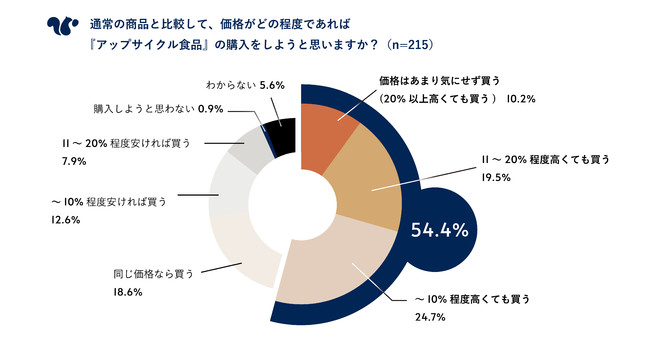通常の商品と比較して、価格がどの程度であればアップサイクル食品を購入する意欲があるか調査したところ「20%以上高くても買う」人が10.2%、「11〜20%程度高くても買う」人が19.5%、「10%程度高くても買う」人が24.7%と、全体の半数以上の54.4%の人が非アップサイクル品と比較して価格が高くても購入する意向を示しました。価格にとらわれず、アップサイクル食品を選びたい意向が高い方が多いことが伺えます。