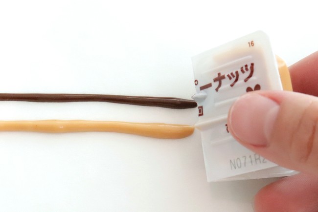 今回のリニューアルでは、ピーナッツの香ばしい風味をしっかりと感じられるスプレッドに改良しました。これにより濃厚なカカオ風味のチョコレートスプレッドとの相性がさらに良くなりました。また、より軽い力で2種類のスプレッドを同時にバランスよく絞り出せるよう、出し口の形状を変更しました。