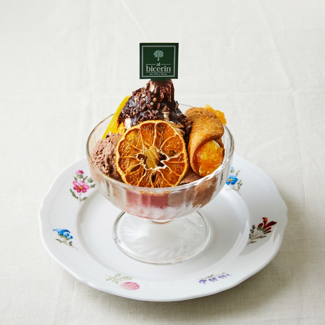 チョコレート、オレンジ、ブラッドオレンジの3種類のジェラートに、ほろ苦いチョコレートソースをかけて仕上げました。フレッシュのみかんから作るジャムを入れたカンノーロをトッピングしたイタリア風パフェです。
