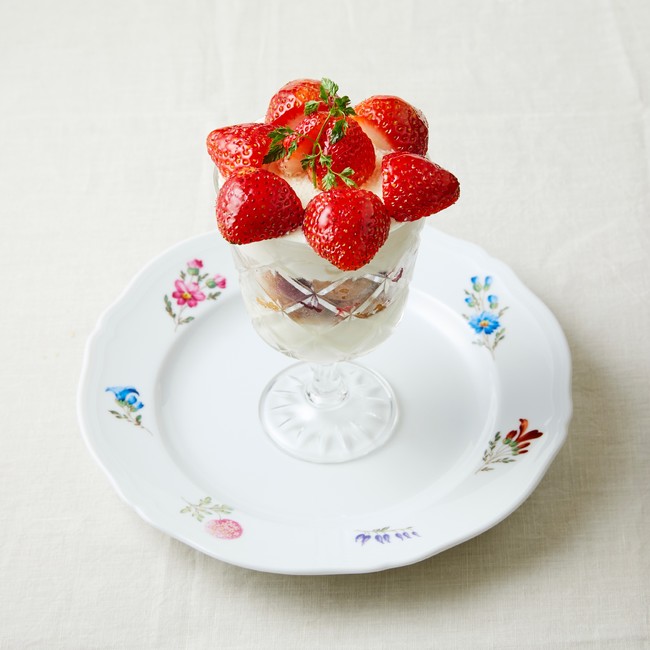 ホワイトチョコレートで作ったムースを中心に、生のままでも美味しい苺をゼリーにして、異なる食感をお楽しみいただけるパフェに仕上げました。濃厚なホワイトチョコレートと程よい酸味のいちごとの相性は抜群です。