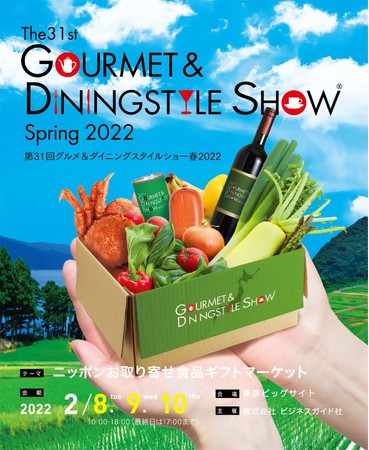 株式会社ビジネスガイド社(本社=東京都台東区、芳賀信享社長)は2月8日~10日、東京ビッグサイト東展示棟3ホールで第31 回グルメ&ダイニングスタイルショー春2022を開催します。テーマは「ニッポンお取り寄せ食品ギフトマーケット」。つくり手の想いがたっぷり詰まった、お取り寄せの食品ギフトが多数出展されます。出展社数は過去最大の359社。会場では新型コロナウイルス感染症防止対策を徹底し、安全・安心な環境を整え、皆様のご来場をお待ちしています。
