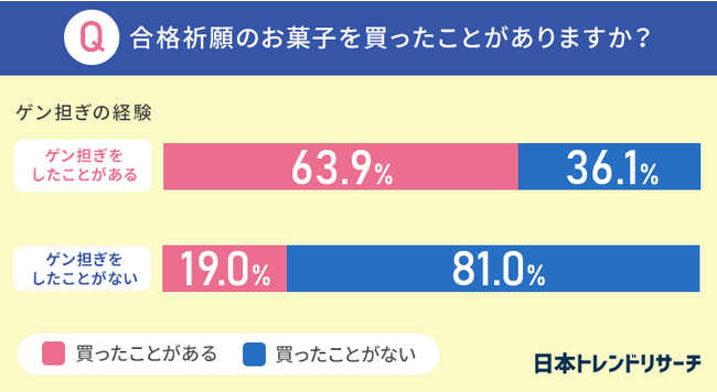 一方で、「ゲン担ぎ」をしていないと回答した方でも19.0%の方は合格祈願のお菓子を購入したことがあるようです。