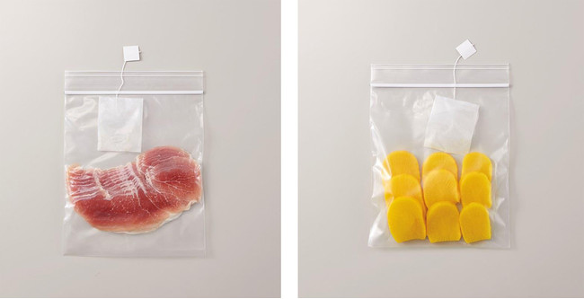 - お手持ちのチャック付き袋に、香り付けしたい食材を入れ、本品を上から吊り下げるようにして入れます。※商品のひもは、チャック付き袋の外に出したまま封をしてください。