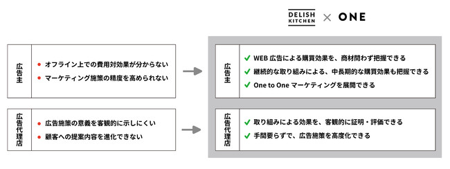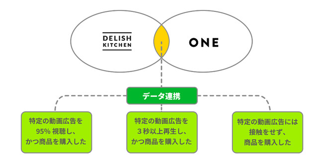 『DELISH KITCHEN』が保有する自社メディアにおけるユーザーデータを、『ONE』が保有する外部購買データと統合することによって、オンラインとオフラインの垣根を超えたマーケティングの精緻化を実現する「レシピ動画広告のオフライン購買検証サービス」の提供が可能になります。認知拡大はもとより、ROI、ROAS、LTVなどの具体的な可視化が求められる広告活動において、いま求められている広告・販促費の最適化を実現します。