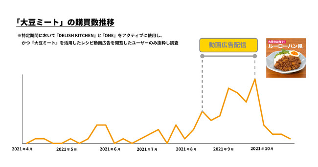 マルコメ(株)の商品「大豆ミート」では、2021年4月から2021年10月の購買数の推移を検証。『DELISH KITCHEN』で制作した「大豆ミート」のタイアップ動画広告「ルーローハン風」のレシピ動画を2021年8月17日から10月1日の期間に『DELISH KITCHEN』 アプリ内でパーソナライズ配信を実施すると、同期間に購買数が大幅に上昇しました。