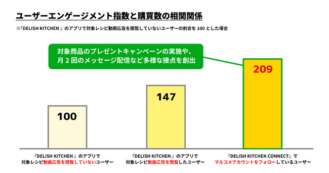 また、『DELISH KITCHEN CONNECT』ではユーザーのエンゲージメント指数ごとに購買数の推移を把握することも可能です。先述のマルコメ(株)では、『DELISH KITCHEN』のアプリ内で同社の公式アカウントをフォローしているユーザーの購買率は、アカウントをフォローしていない/動画広告の閲覧もしていないユーザーの購買率に比べて2倍以上も高い数値となっています。