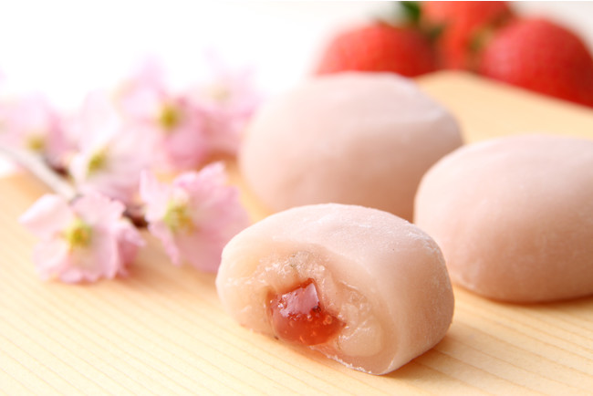 毎年大人気の「ちとせのさくらいちご餅」は栃木県産とちおとめを使用した甘酸っぱいいちごソースを
