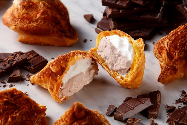オーブンで焼き上げたサックサクのパイに、北海道産生クリームとマスカルポーネでまろやかに仕上げたミルククリームと、チョコチップの食感がアクセントのコク深いヘーゼルナッツショコラクリームの2つのクリームを詰め込みました。ミルククリームとヘーゼルナッツショコラクリームが混ざりあう、東京ミルクチーズ工場ならではのおいしさが詰まった逸品です。