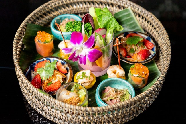 ベトナム風生春巻きには、フレッシュなサーモンとイクラをトッピングし贅沢に。ソムタムは、あまおうとザクロという珍しい組み合わせで、甘酸っぱさが後をひく美味しさに仕上げました。