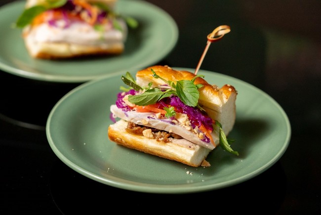 バインミーには、オリジナルのハーブバターとレバーペースト、ガパオ、低温でしっとりと仕上げた蒸し鶏をサンド。甘酸っぱいなますとコールスロー、ミントやパクチースプラウトなどのハーブが味のアクセントです。