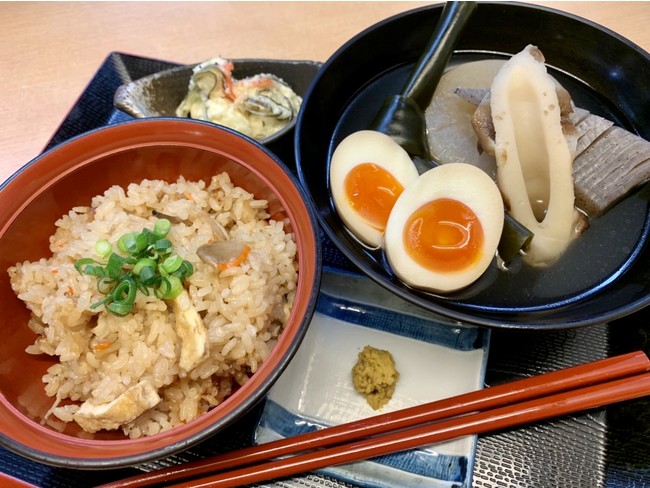 ■関内店:おでん5種・きのこ混ぜご飯・小鉢・お出汁付き 800円(税込)