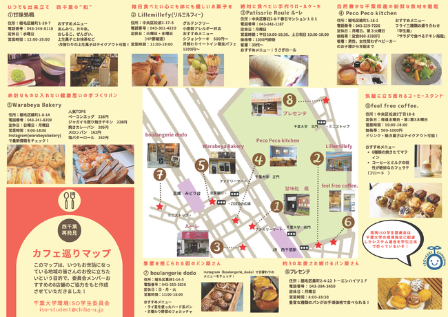 千葉大学環境ISO学生委員会は、地域社会を応援する企画として、キャンパス周辺地域においてカフェやパン屋など8店舗の情報を掲載した「西千葉再発見!カフェ巡りマップ」を作成し、1月24日(月)に配布を開始しました。