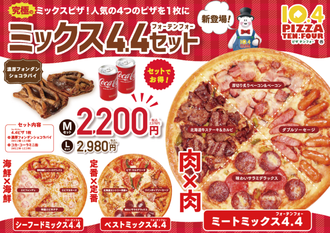 北海道発!宅配ピザ「テン.フォー」を運営する株式会社テンフォー (本社・北海道函館市/代表・髙橋仁志)は、2022年2月1日から「究極の」ミックスピザ3種を新発売。スイーツ&ドリンク付きセットでご提供いたします。