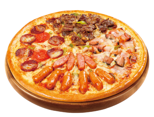 北海道産の牛ステーキと牛カルビをじっくりと炙り、テリヤキソースを絡めた”北海道牛ステーキ&カルビ”や洞爺湖サミットでも使われた農家のベーコンを贅沢に使用した”厚切り炙りベーコン&ベーコン”他、 肉づくし4種の究極ミートピザです。