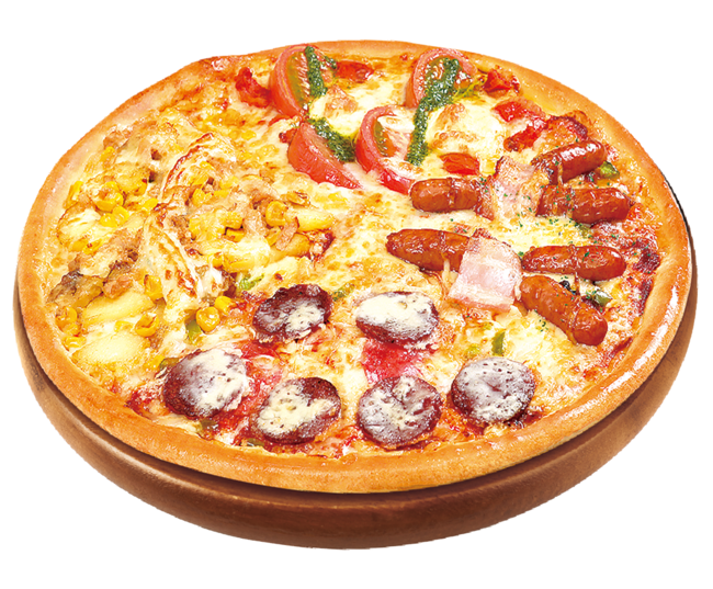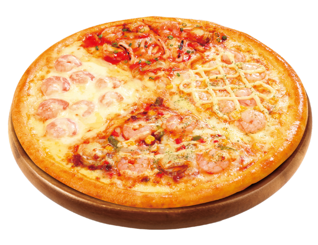 4種の海鮮を贅沢に使用した”香味海鮮シーフードデラックス”とエビたっぷり定番”エビマヨネーズ”、とろ〜り食感が楽しい”エビフォンデュ”、彩り豊かな”特選エビホタテ”の4種のシーフードピザが1つに。海鮮をこれでもかとトッピングした究極ピザです。