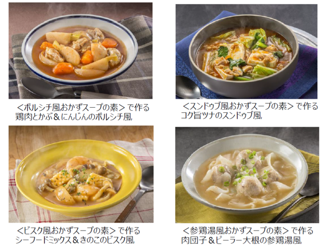 共働き世帯の増加や内食頻度の増加に伴い、献立のレパートリーや簡便化への課題は大きくなっています。その中で2019年にクックパッドの食トレンド大賞に「おかず味噌汁」が入賞し、また料理レシピ本大賞では「おかず味噌汁・スープ」に関するレシピ本が選出されるなど、「1品で完結するおかずスープ」に注目が集まっています。このようなトレンドをふまえて、2021年8月に「StewP〔シチュープ〕」シリーズを発売しました。今回は、ご家庭で楽しんでいただくメニューの幅を広げるため、<ボルシチ風おかずスープの素>と<スンドゥブ風おかずスープの素>を追加しました。