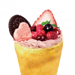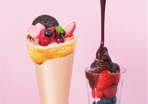 濃厚なチョコレートホイップとチョコレートソースに、甘酸っぱいベリーと苺を合わせた贅沢なクレープです。食感のアクセントにココアビスケット、トッピングにハート型のストロベリーブラウニーを添え、味も見た目もお楽しみ頂けます。