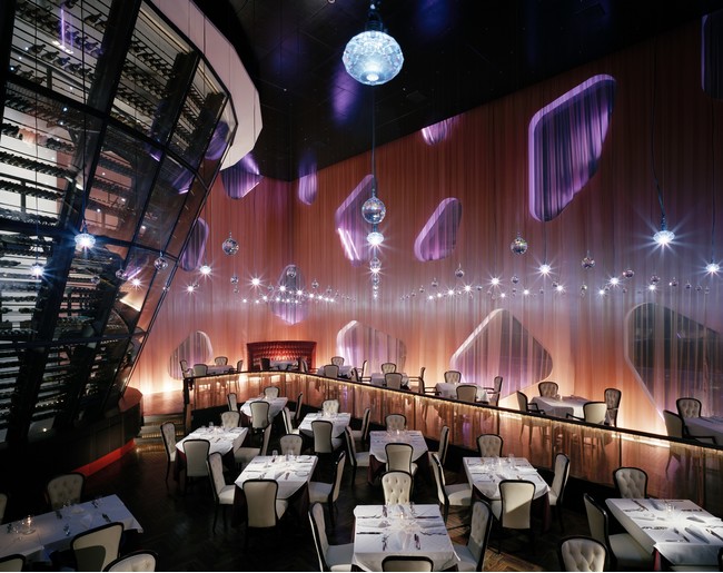 解放感あふれる天井高9メートルのフロアは、国内最大級のワインセラーとスワロフスキーの装飾が相まって光り輝く宝石箱のような空間が広がります。