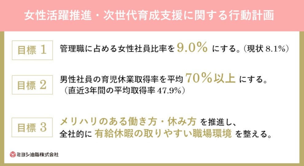 ミヨシ油脂株式会社(本社:東京都葛飾区、代表取締役社長兼CEO:三木逸郎)は、次の通り女性活躍推進法(※1)・次世代育成支援対策推進法(※2)に基づく行動計画を策定しました。女性がより活躍できるように支援し、さらに全社員にとって、より働きやすく働きがいを実感できる環境を目指します。具体的な行動計画を3つの目標ごとに設定しました。計画期間および具体的な内容は下記の通りです。