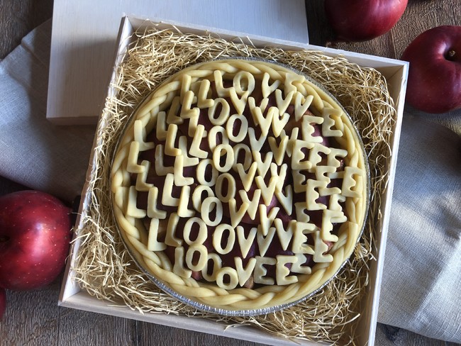 Pie Holicの今年のバレンタイン商品は、木箱に入ったインパクト抜群のメッセージパイ。愛の象徴でもあるりんごを使ったアップルパイに、「LOVE」クッキーをぎっしり敷き詰めました。真っ赤な皮と爽やかな酸味が特長の紅玉を使用しています。シナモンやクローブの効いたオリジナルのシーズニングに漬け込み、スパイスの香りとりんごの甘みがベストなバランス。開店以来、店頭で不動の一番人気を誇るダッチアップルパイと同じ味付けです。