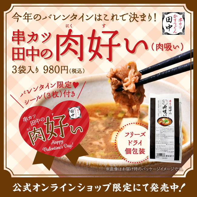 株式会社串カツ田中(本社:東京都品川区東五反田、代表取締役社長:貫 啓二、以下:串カツ田中)は「串カツ田中オンラインショップ」にて販売中の『肉吸い』の内容を変更し、バレンタインギフト『串カツ田中の肉好い♡(肉吸い)』 として1月27日(木)~2月10日(木)の期間限定で数量限定販売いたします。