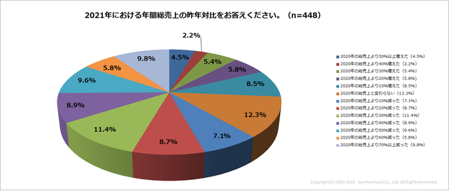続いて、2021年の年間総売上の昨年対比(※)について尋ねたところ、「2020年の総売上と変わらない」との回答が12.3%と最も多く、これに「30%減った(11.4%)」、「70%以上減った(9.8%)」との回答が続く結果になりました。全体では「昨年よりも総売上が増えた」との回答が26.4%得られた一方、61.3%が「昨年よりも総売上が減った」と回答しており、半数以上の飲食店で苦しい状況が続いていることがわかります。