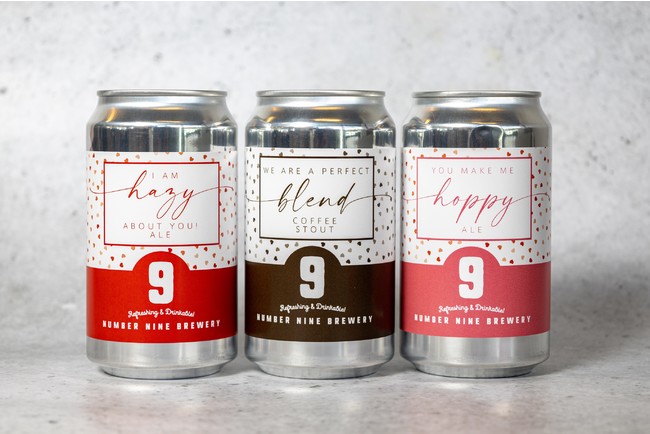 今回は、ニュージーランドでビール造りを行っていた経験を持つNUMBER NINE BREWERYの醸造責任者 齋藤健吾が「HAMMER HEAD ALE」(ハンマーヘッド・エール)、「#9 HAZY」(ナンバーナイン・ヘイジー)、「COFFEE STOUT」(コーヒースタウト)のおすすめ3種をチョイス。それぞれ、赤・ピンク・茶色の小さなハートマークが散りばめた限定ラベル缶にお詰めし、特別感を演出いたしました。