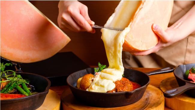 大人気のラクレットチーズは、厳選しこだわり抜いたフランス直輸入のラクレットレクリュを使用。ナッツのような香ばしさと、大迫力の滝のように流れる滑らかさが特徴で、日本人好みの味わいのチーズです。お客様の目の前で、3種類のグリルの上にダイナミックに流しかける人気商品となっております。