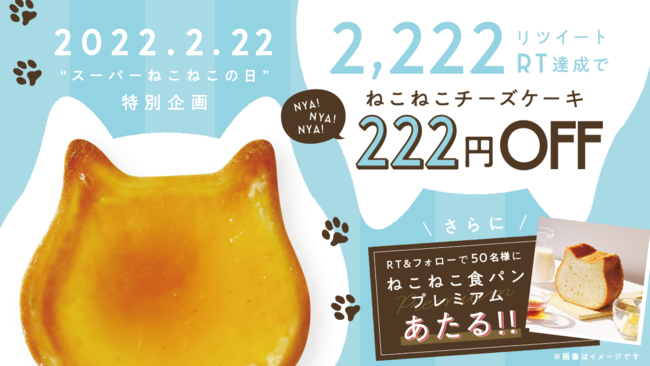 さらに、2,222リツイート達成で2022年2月22日(火)~2022年2月28日(月)の期間中、店舗&オンラインストアにて「ねこねこチーズケーキ」222円OFFのセールを実施いたします。