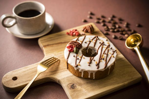 ホワイトチョコをまとったカフェオレバウムには、アーモンドプラリネ、カカオニブをトッピング。見た目も華やかな仕上がりに!