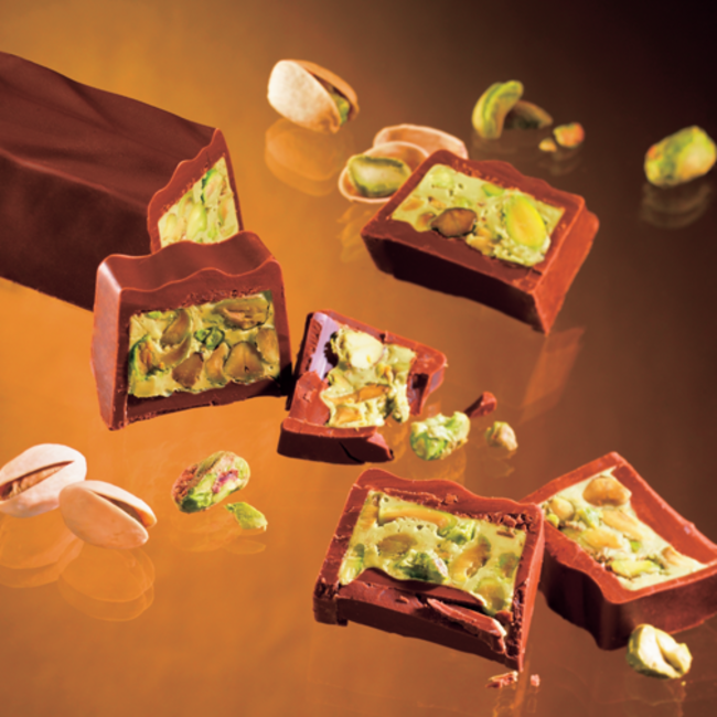 香ばしくコク豊かなピスタチオクリームに、深煎りしたピスタチオと塩がけしたピスタチオの2種類を混ぜ込んで、口どけの良いミルクチョコレートにとじ込めました。切り分けると、なめらかなピスタチオクリームとたっぷり入ったピスタチオが表情豊かに顔をのぞかせます。ピスタチオの香ばしく旨味あふれる魅力を引き出した、ピスタチオづくしの味わいを存分にお楽しみください。好きな厚さに切り分けて食べるスタイルが楽しいチョコレートです。
