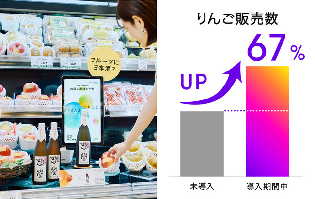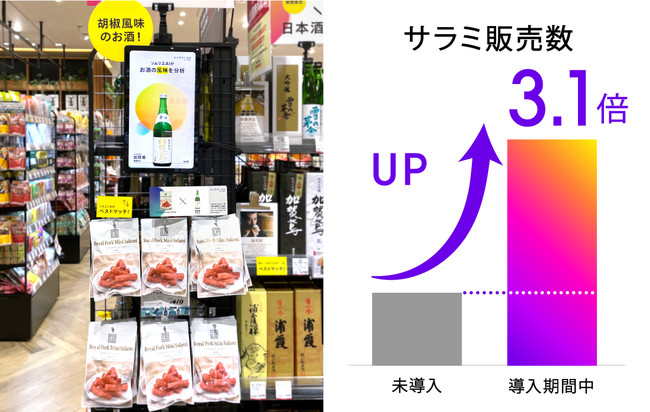 結果として、ペアリングの総効果は売上39%UPを記録。特に、りんごは販売数67%UP、サラミは販売数3.1倍UPを記録しました。さらに、サラミのペアリング商品としてレコメンドされていた「福光屋加賀鳶 極寒純米」は、販売数が22倍まであがりました。