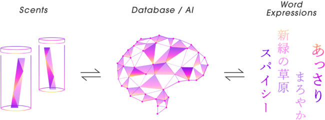 KAORIUM は、セントマティックが開発した香りと言葉を相互に変換するAI システムです。最先端のテクノロジーによって、曖昧で捉えにくい香りの印象を言葉で可視化したり、ある言葉に紐づく香りを導き出したりすることを可能にします。また、言葉を意識しながら香りを深く味わう体験は左右両脳を活性化し(※1)、私たちのまだ見ぬ感性への気付きをもたらします。香りと言葉をつなぐ今までにない体験が生み出す価値は、フレグランスの世界にとどまらず、感性教育、飲食体験、購買体験など様々な分野に新しいビジネスチャンスを生み出すものとして、その可能性に大きな期待が寄せられています。