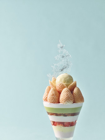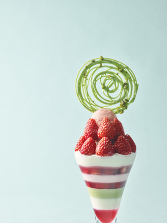 クイーンのティアラのような、シルバーラメがきらめく飴細工に、白苺の高級感あふれる女王(クイーン)のような “春いちごクイーン”パフェには、白苺&バニラアイスクリーム&木の芽風味の苺ソルベ、苺と桜のシャンティークリーム、抹茶パンナコッタ、苺と日本酒のジュレ、苺と桜のパンナコッタ、グランマニエ風味カスタードクリーム、桜苺のシャンティークリーム、日本酒ジュレに浮かべた塩漬けの桜をバランス良く重ね、食べ進めるたびに違った食感や味わいが広がります。桜の香りや抹茶の渋み、日本酒のエッセンスなど、和のテイストを秀逸なバランスで装いもエレガントに仕上げています。