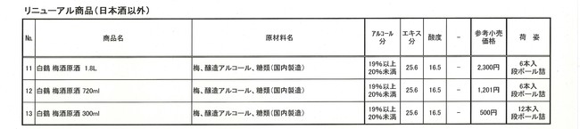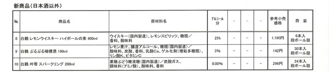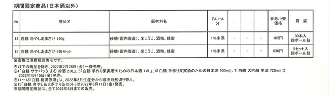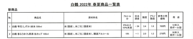 詳細は「白鶴2022年 春夏商品一覧表」(画像)をご覧ください。