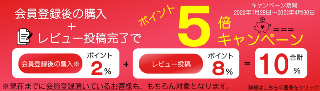 また、口コミ機能の採用に際し、多くのご意見ご感想を頂きたいと思いこの度「会員登録後の購入+口コミ投稿でポイント5倍キャンペーン」を2022年1月30日より開始いたします。