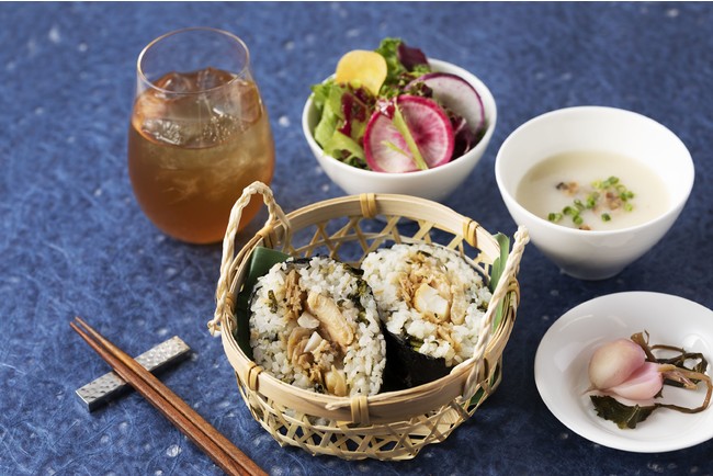 能登前寿しの定義である「1.能登の里山で栽培したお米を使用」「2.地元の旬のネタを使用」「3.汁物付き」を守りながら、八芳園MuSuBuシェフが開発した「能登・七尾MuSuBu寿し」を味わう寿し御膳。「七尾のイカと能登大根の旨味たっぷりスープ」を汁物としてご用意し、能登半島で農薬を使用しない栽培に取り組む「あんがとう農園」さんの新鮮な野菜を使用したサラダをセットでお届けいたします。