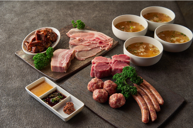 生ソーセージ、ロース、黒豚ミニハンバーグ、黒豚ベーコン、シャトーブリアン、ホルモン、塩だれ、つけだれ、肉吸い濃縮