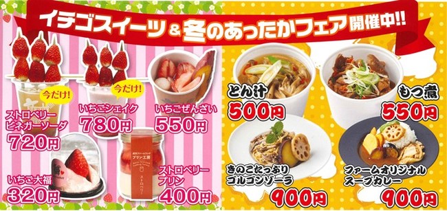 さらに店舗内の飲食広場ファームキッチンでは旬ないちごを使ったデザートや、旬な農作物を使った『あったかフェア』も開催しております。