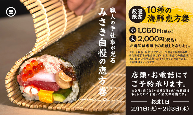 株式会社FOOD & LIFE COMPANIES(本社:大阪府吹田市、代表取締役社長 CEO:水留 浩一)の子会社である株式会社 京樽(本社:東京都中央区、代表取締役社長:石井 憲)が展開する「回転寿司みさき(旧:海鮮三崎港)」では、2月3日(木)の節分の日に合わせて、こだわりのネタを味わえる「10種の海鮮恵方巻」を店頭・電話・一部期間ネットにてご予約を承っております。