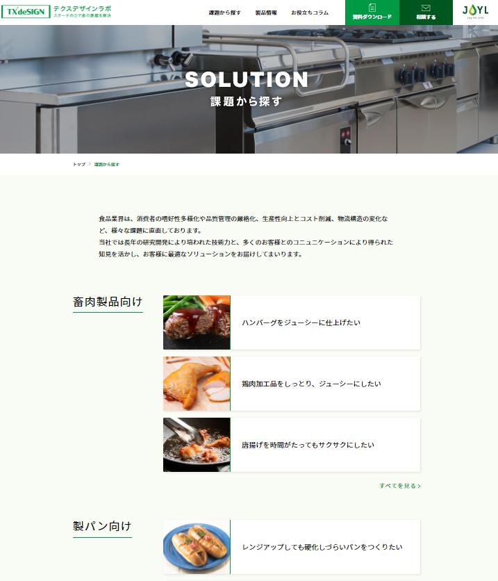 ①「課題から探す」・・・食品加工でよくあるお悩みと解決のポイント、当社からのご提案を掲載