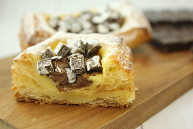 さっくりデニッシュになめらかなカスタードクリームを絞って焼き上げ、ベルギー産クーベルチョコレートを使用したやわらかなチョコレートクリームと、チャンクチョコをトッピング。カスタードとチョコレートの2種類のクリームがとろける贅沢な組み合わせです。
