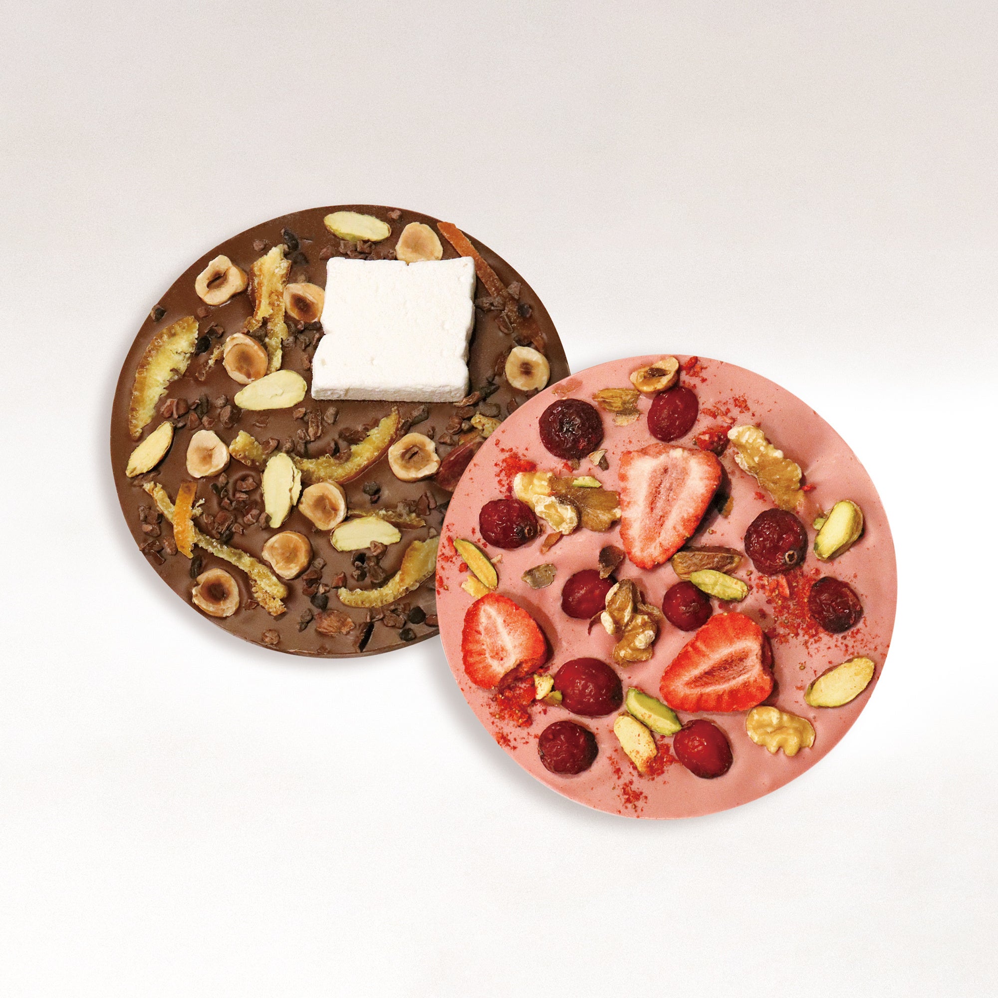 ドライフルーツやナッツなどを贅沢にトッピングした「バークチョコレート」は、ルビーチョコレートとミルクチョコレートの2種類をご用意。