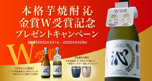 「令和3年 福岡国税局管内酒類鑑評会」焼酎の部において、「本格芋焼酎 沁」が栄えある「金賞」を受賞いたしました。また、「第9回 福岡県酒類鑑評会」焼酎の部でもあわせて金賞を受賞しました。今回W受賞達成を記念し、特別セットをご用意し先着50名様に「保温タンブラー2色セット」をプレゼントいたします。