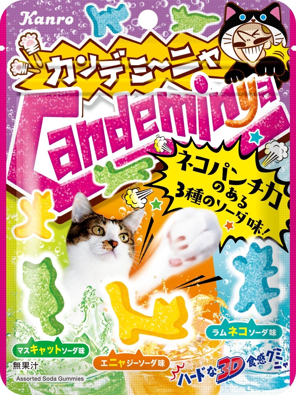 「カンデミーニャグミ」は7(ニャニャ)種のかわいいネコ型グミが入っており、フレーバーはネコにちなんだ3種のソーダ味「マスキャットソーダ味」、「エニャジーソーダ味」、「ラムネコソーダ味」が楽しめます。カンデミーナシリーズ特有の独特な形状から生まれる弾力食感&パンチ力にかわいらしさを兼ね備えた商品となっています。