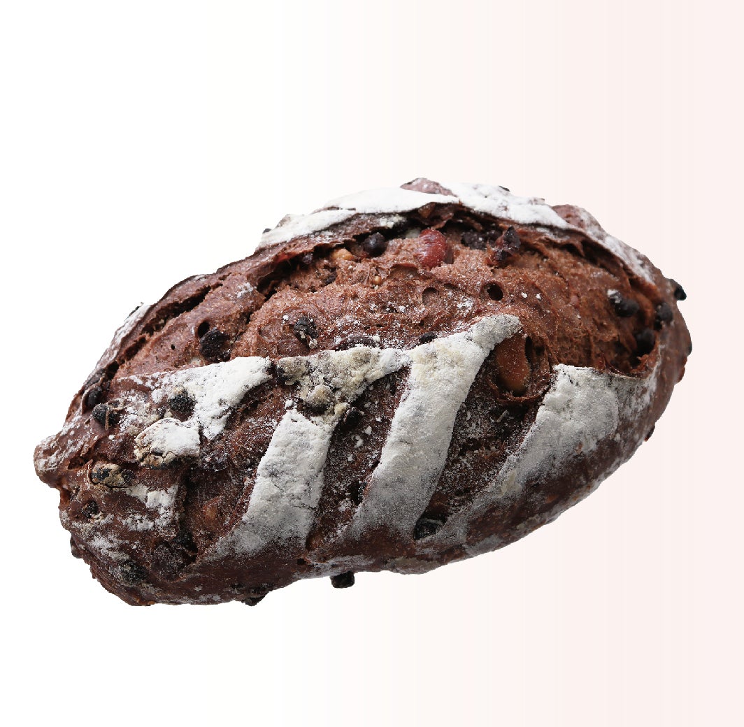 ココアのルヴァン生地に、ほんのりビターなフランス産チョコレートとクランベリー・ カシューナッツ・ホワイトチョコを入れて 焼き上げました。