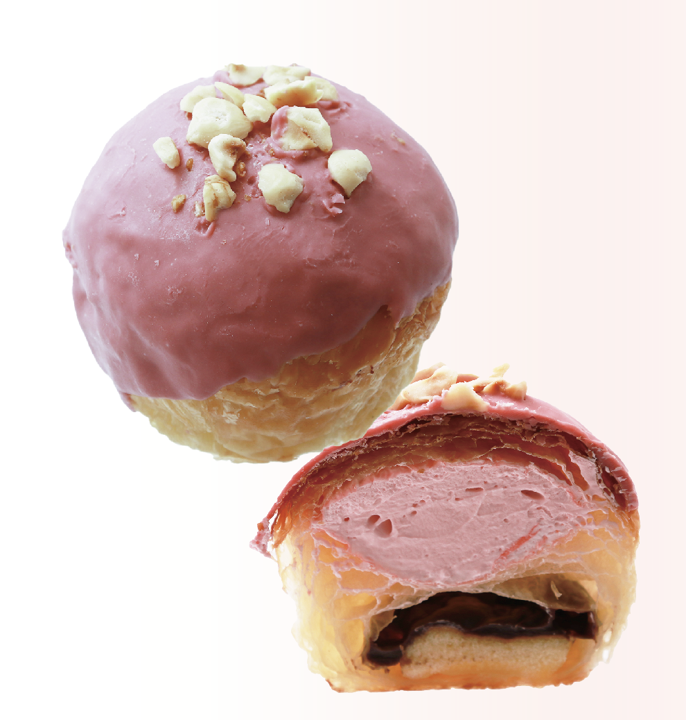ベルギーチョコのクリームを包んだデニッシュ生地に苺のホイップクリームをギュッと絞りこ み、ルビーチョコをあしらいました。